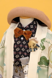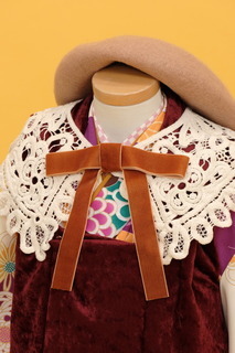 襟元のレースや柄シャツ、ベロアのリボンの洋小物で、大正ロマンのレトロ感を演出。 帯締めやシャツの柄の締め色にすることで、おとな過ぎないかわいらしいコーディネートセット。