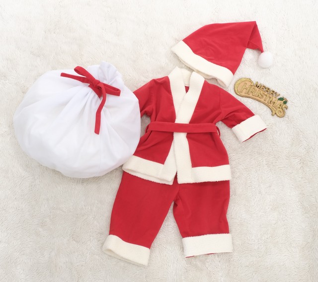 かわいらしいサンタクロースのお衣装とクリスマスツリーと一緒に