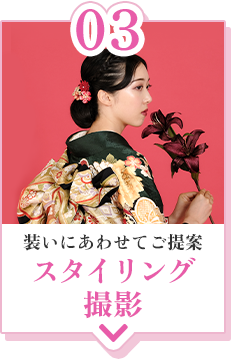 ご家庭で伝統の振袖や、成人の第一歩を踏み出す新しいスーツ。ご家族ならではの装いにあわせてスタイル提案♪